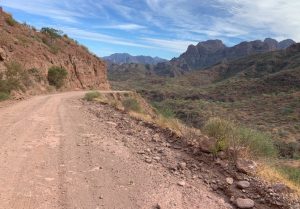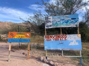 4 hours or so northeast of La Paz there is an innocent sign on the highway directing one to turn off for Agua Verde. It includes no warnings or mileage marker, just the images for a beach, camping and restaurant. In fact the road is paved for a while, almost the first 10 kilometres.