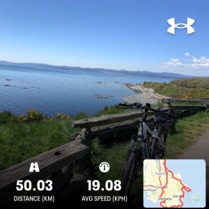 My way home was via the Lochside and Galloping Goose Trails. Esquimalt is home, so my route took me over the Selkirk Trestle and through Banfield Park. The sun was low, the battery on my e-bike even lower by the time I wheeled my way into the parking garage.