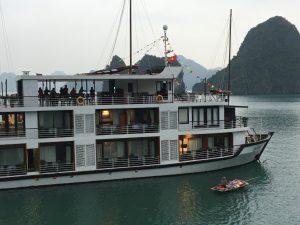 The pressure on Ha long Bay from tourists is immense. There must be hundreds, if not thousands of cruise boats out here. I can see 13 from my cabin without craning my neck. There are these long working boats that I see occasionally and it seems to me their job is to pick garbage out of the sea. There are some enterprising ladies who rowed by last night and this morning, a convenience store on the water. They had Pringle’s and peanuts and wine and whisky among other things. A bottle of wine on this ship is 1.2 million dong (about $70 CDN) while on the floating barge its 300,000 dong (about $18 CDN) . I came aboard with 3 bottles of my own at 185,000 dong (about $10 CDN).