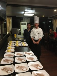 Ha Long Bay is a World Heritage site, and no trip to northern Vietnam would be complete without a junk boat cruise. You can spend as little or as much as you want, we are on a budget boat – $600 CDN for two nights for two people. Our food and activities are included. The meals are spectacular artistic creations. Both lunch and dinner yesterday were five courses. This mornings “light” breakfast included eggs, meats, cereal, yogurt, fruit, cheese and pho. I walked on but I’ll be waddling off.