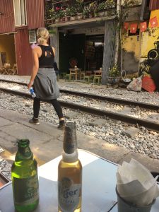 We accidentally defied the law and had beers and spring rolls on infamous train road. Twice a day, the train passes by this road mere inches from the shops and restaurants here. I’ve read it’s a terrifying experience. The government has decided to close it for safety reasons, but the shop owners aren’t pleased. We walked past a barrier and took a seat just inside the banned area with no resistance, and then watched while police with whistles tried to prevent others from doing the same. Another couple got through and joined us, and we spent a wonderful hour of entertainment, drinks and conversation. No train went by, but where we exited there was heavy police presence.