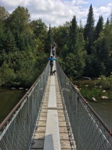 The trail from Old Pinawa to Alice Chambers trail follows the channel. The trail is easy to follow but the tread is quite riddled with tree roots. Only one tree remains blocking the way, but it was easy to step over. A bike would have to stop. We had two rowdy dogs with us on this leg of the trail, Tucker and Barley. We joked about strapping Fitbits to them. They must have had 5 times the number of steps we did. The two shared water bottles, treats and even dog food at the Suspension Bridge.
