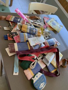 I cleaned out the sewing basket, threw out every open package and kept only the sealed ones. The variety of zippers, binding and other assorted items were all bought more than 50 years ago, almost all from Eaton’s according to the labels. I could picture my Grandmother shopping the sales up there on the fourth floor, probably hiding them from my Grandfather in this wicker sewing basket. Sold on Facebook, it’s going to be someones Christmas present.