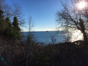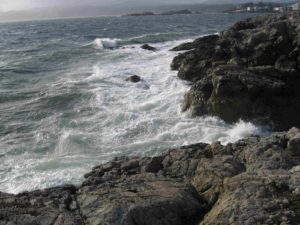 I’m standing at Fleming Beach, which closes once each week when Victoria’s sewage releases into this bay untreated. It’s unsafe for the dogs to swim there that day. The city posts a sign. Maybe she’s angry about that. I watched a debate in this harbour about why the Killer Whales are disappearing: is it salmon fishermen or oil tankers?  Somehow she’s attached to that beach in Mumbai we walked down, where garbage is bulldozed into the ocean daily. Her coral is dying, her fish depleted. Maybe she’s reacting to that?